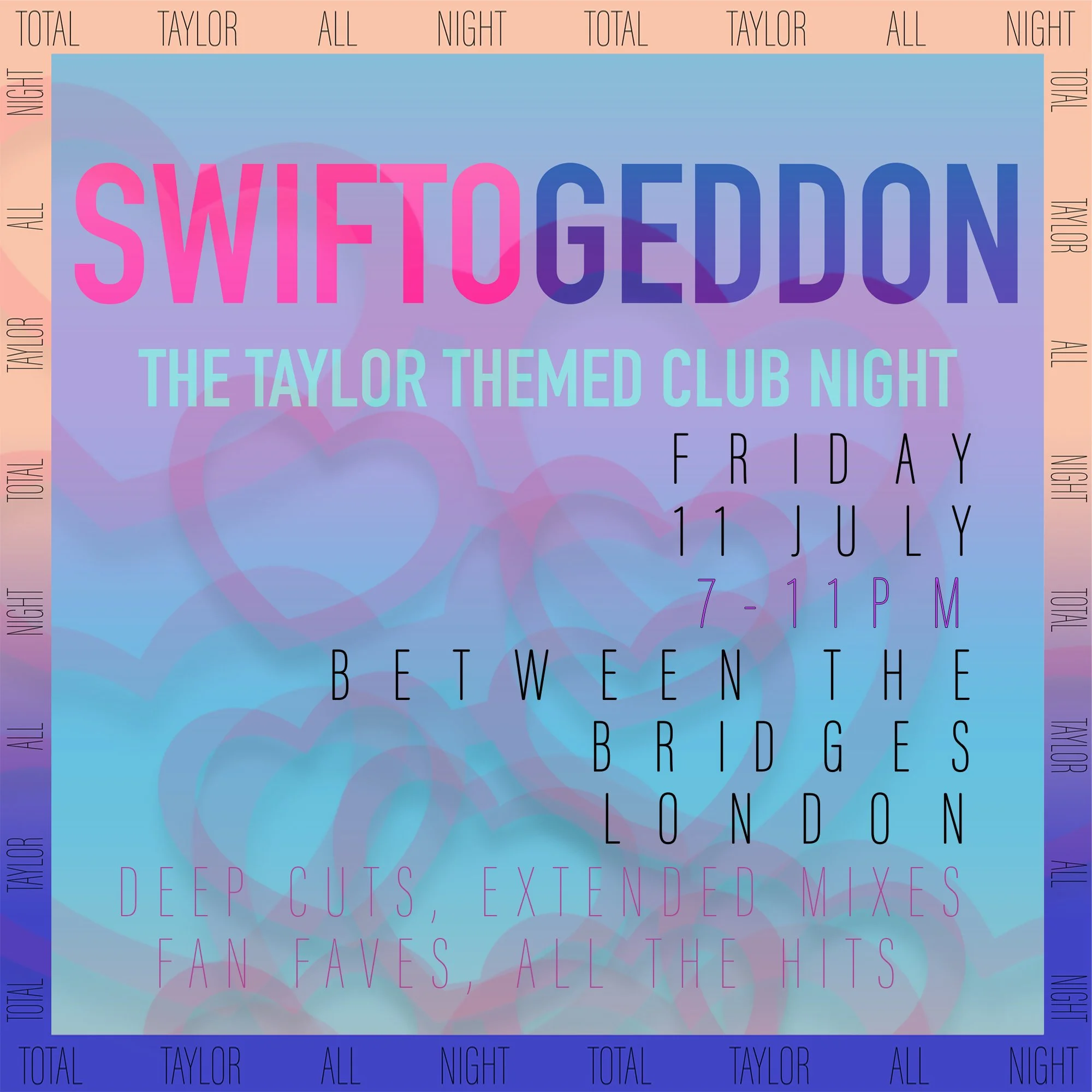 The clubnight dedicated to worshipping at the altar of Taylor Swift is returning to Between the Bridges in London for a special early summer show! We'll be bringing you non-stop Swifty: deep cuts, extended mixes, fan favourites and all the hits!